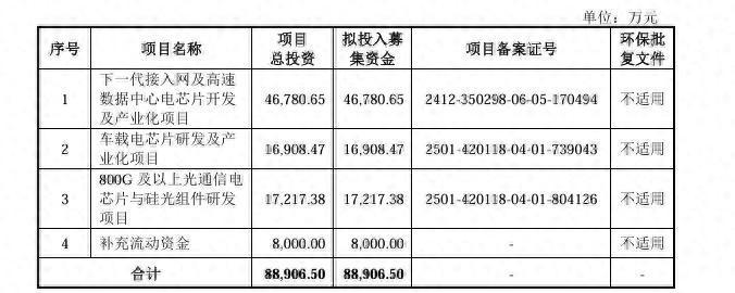 目前公司已实现155Mbps~ 100Gbps 速率光通信电芯片产品的批量出货,并正在积极研发50G PON收发芯片、400Gbps 及 800Gbps 数据中心收发芯片、4通道128Gbaud相干收发芯片、 FMCW激光雷达前端电芯片、车载光通信电芯片等系列新产品。