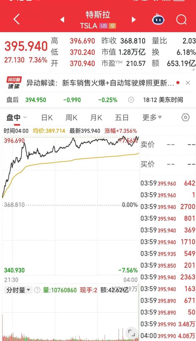 特斯拉报 395.94 美元,涨 7.36%,市值 1.28 万亿美元。值得注意的是,特斯拉股价最近两日已累涨逾 13.8%,2 个交易日市值累计增加 1553 亿美元(约合人民币 11064 亿元)。