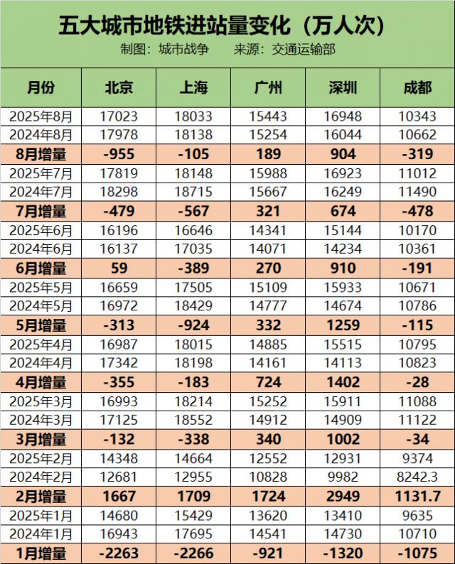 2025 年 8 月,上海地铁进站量相比去年同期减少 105 万人次;