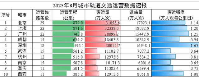 近日,交通运输部发布了" 2025 年 8 月城市轨道交通运营数据速报",有两个指标备受关注,一个地铁进站量,另一个是地铁客运量。