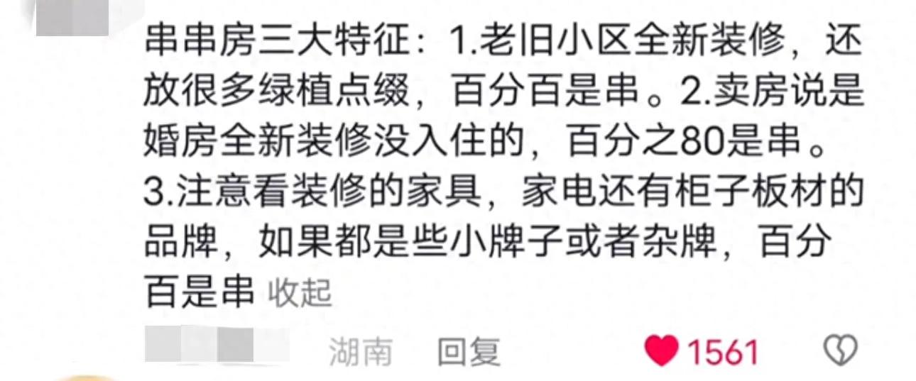 还有一招,扒开插座看电线,大部分串串房都用垃圾电线,2.5线换成1.5的没品牌的垃圾线。如果发现电线规格不对100%是串串,很多串串房的电线都带线头埋在墙里,还容易发热起火!!